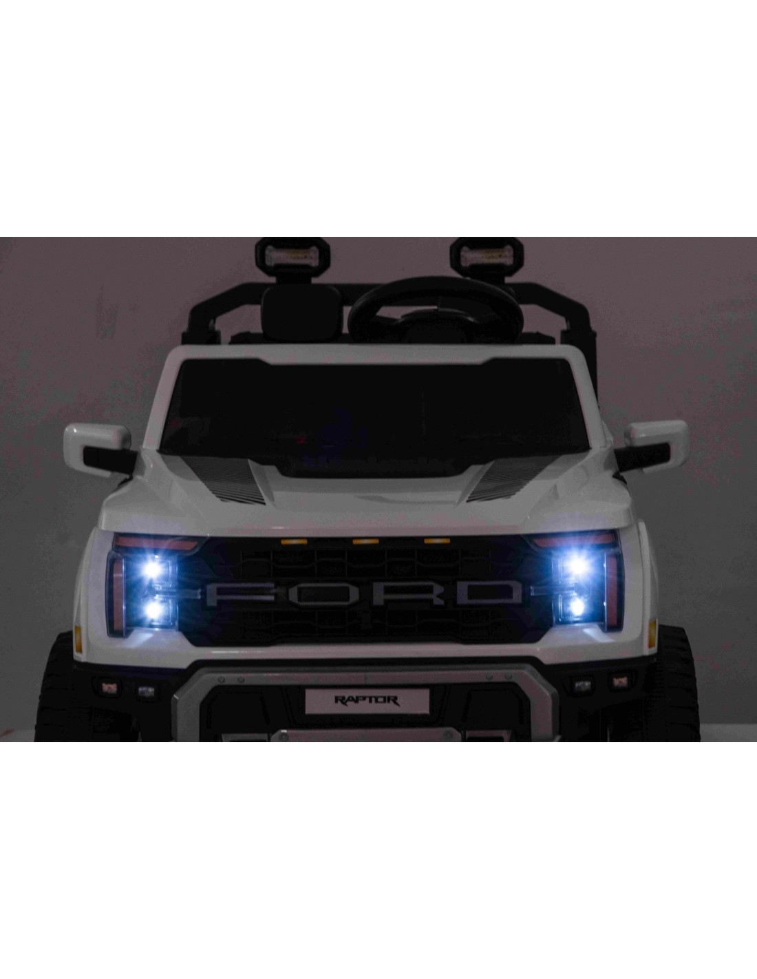 LED-lygterne gør bilen genkendelig som en ægte Ford Ranger – også når mørket falder på. Instrumentbrættet og rattet med Ford-logo fuldender det eksklusive look og giver barnet en autentisk oplevelse bag rattet.