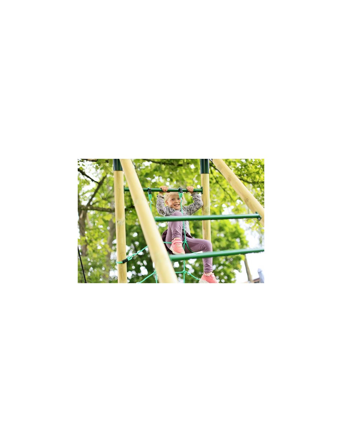 Stærke spænderinge til ophængning af gyngerne giver mulighed for ophængning af andre legeredskaber såsom baby sæde til mindre børn. Sæderne på gyngerne er produceret i robust UV-bestandig plast med bløde afrundede kanter.