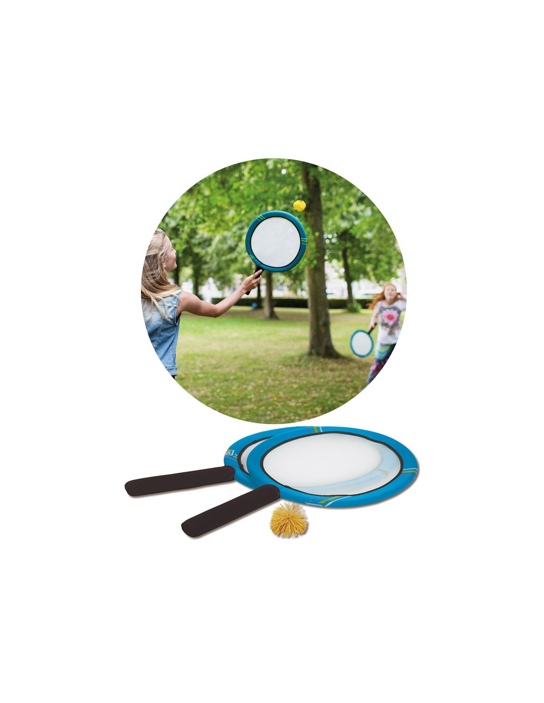 Bounce Tennis er det perfekte udendørsspil til børn fra 6 år og op. Udstyret med to elastiske ketchere i neopren (størrelse 57 x 32 cm) og en blød, fluffy bold, giver dette spil ekstra sjov, da bolden hopper højere end normalt. Børnene kan spille traditionelt tennis eller finde på kreative lege, som at holde bolden flyvende eller sende den så langt som muligt. Det styrker både grovmotorik og koordinering, mens børnene får masser af udendørs leg.