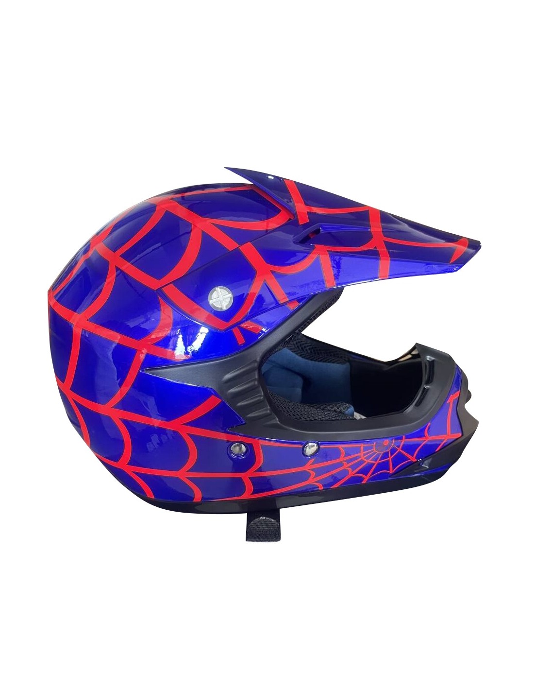 Giv dit barn maksimal sikkerhed og et råt look med den nye SpiderBlue børne crosserhjelm. Modellen er udviklet specielt til børn, der elsker fart, leg og offroad-eventyr – og kombinerer høj beskyttelse med et stærkt visuelt udtryk i blå og rød med spindelvævsgrafik.