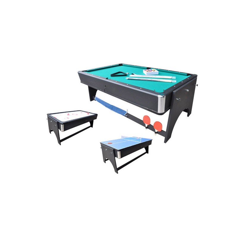 Bordet har Airhockey på den ene side og pool på den anden side. Bordet kan hurtigt drejes rundt ved at løsne boltene. Der medfølger en træplade med bordtennis på den ene side (blå plade med hvide striber) og spisebord på den anden side (sort plade). Bordpladen er 213 x 122cm. bred.