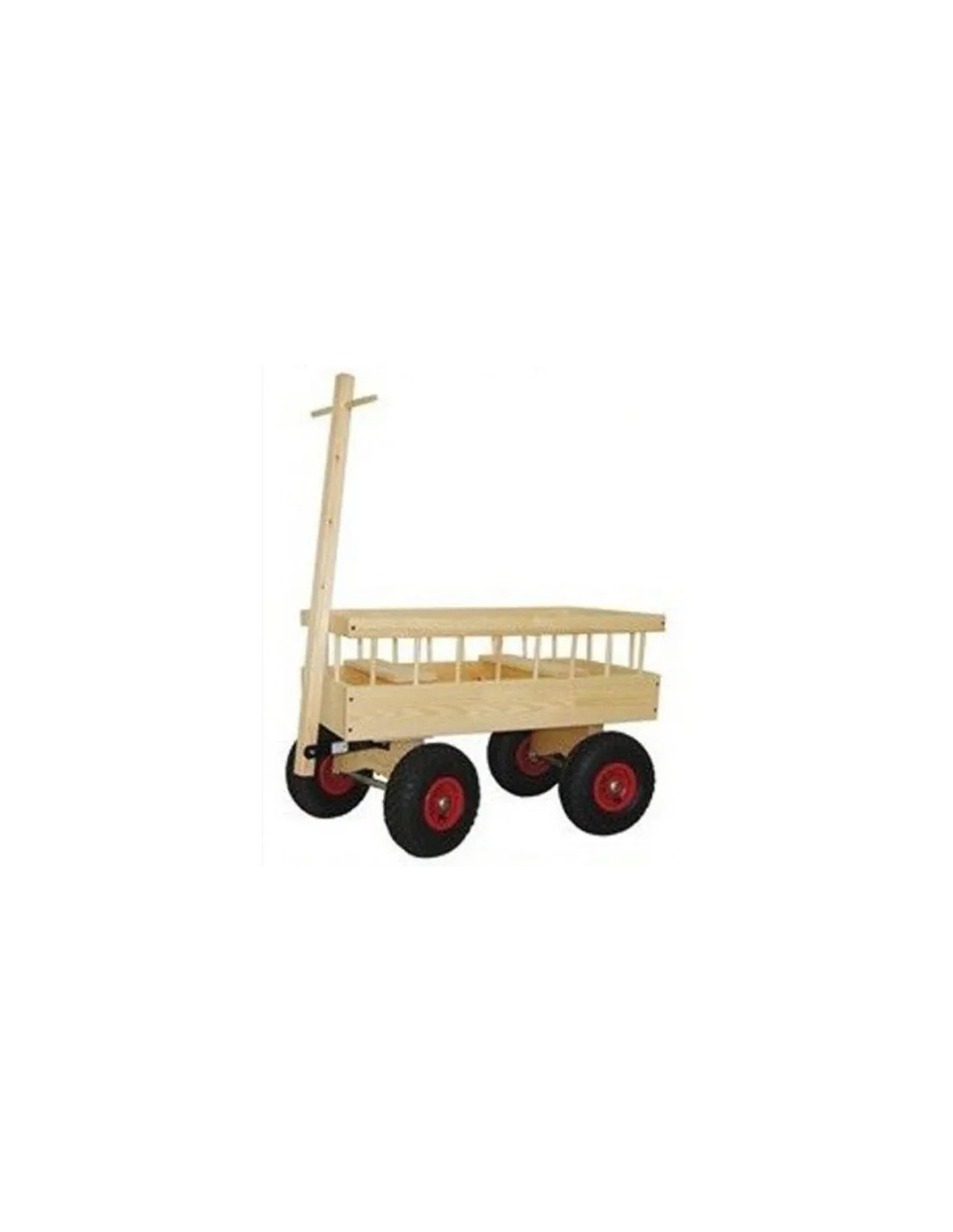 I denne danskproducerede trækvogn er der plads til to personer på separate sæder. Den er solidt bygget i ubehandlet skandinavisk fyrretræ og udstyret med 26 cm luftgummihjul, der sikrer en behagelig kørsel. Vognen er CE-mærket.